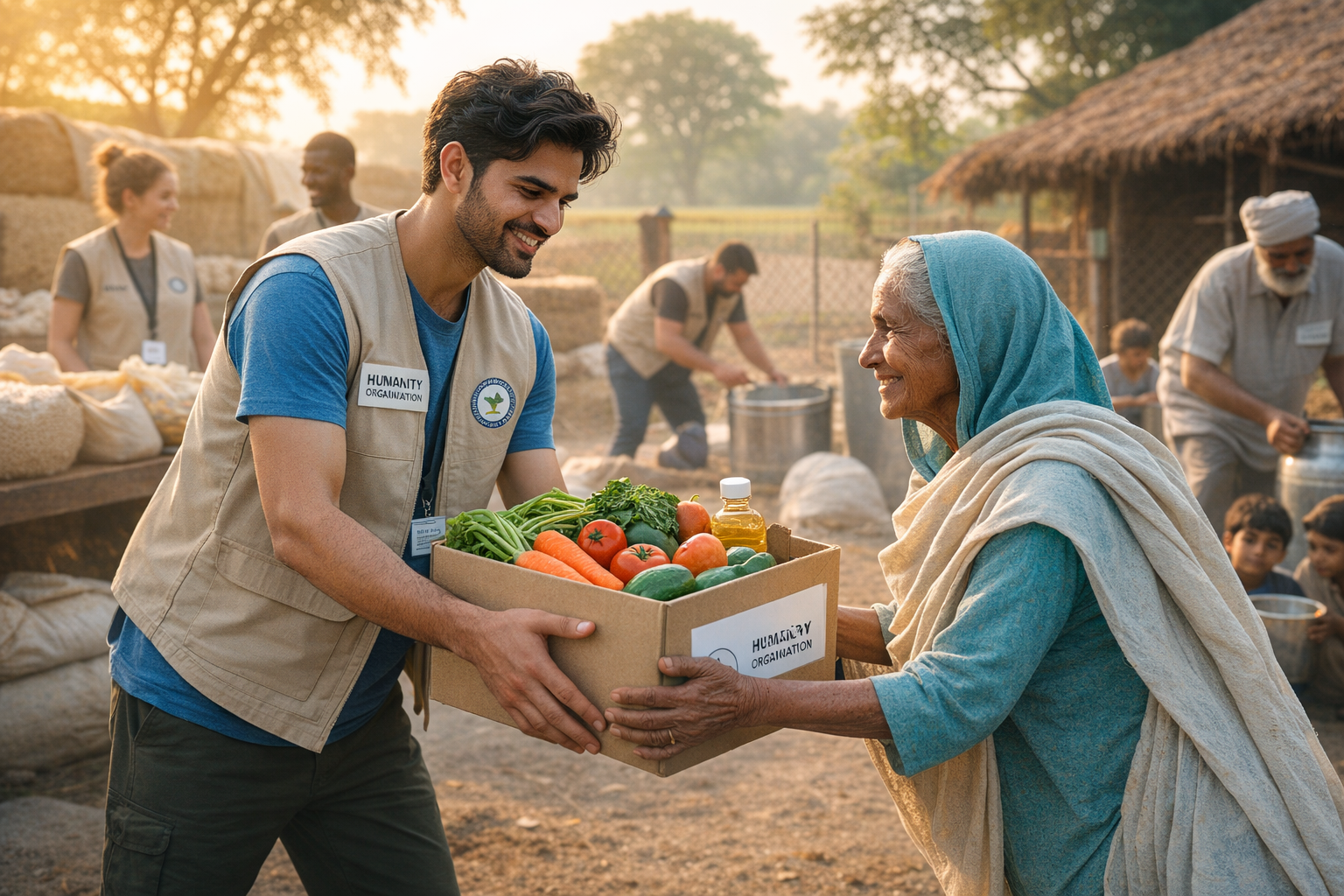 This powerful image captures the essence of community support, showing volunteers distributing fresh meals to...